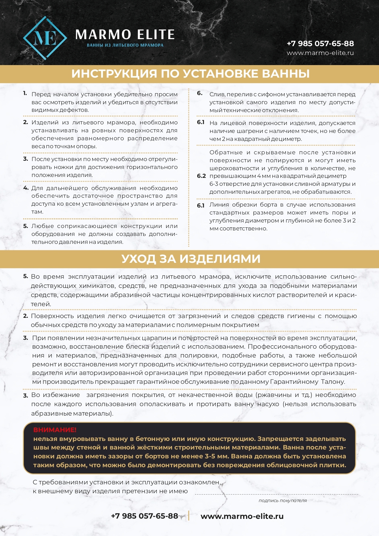 наличия повреждений, которые могли возникнуть при транспортировке. В случае обнаружения незамедлительно сообщите об этом в магазин, где приобрели ванну.